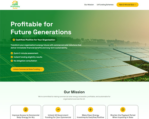 Mission / USP: Accelerate the UK’s Clean Energy Revolution by Facilitating Access for ALL UK Organisations (Private Sector, Public Sector, Schools, Hospitals and Non Profits) to Cashflow-Positive Solar Solutions While Matching Them with Britain’s Best Commercial Solar Providers.